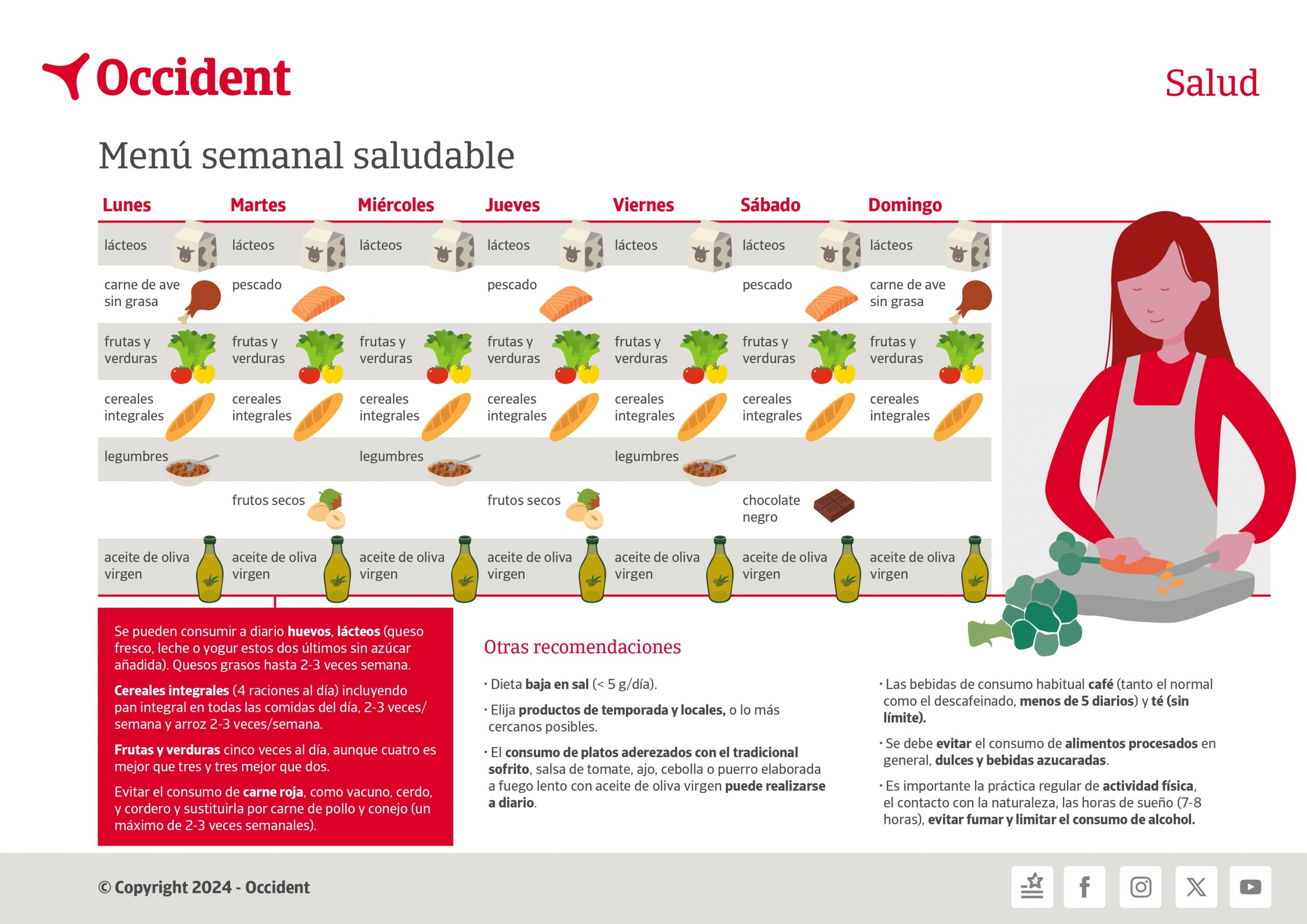 En nuestro entorno el menú saludable se caracterizada por un patrón de consumo que incluye abundantes verduras, frutas, legumbres y frutos secos; pescado, carne de ave sin grasa, lácteos fermentados (yogur y queso), y escaso consumo de carnes y derivados, alimentos procesados en general, dulces y bebidas azucaradas.